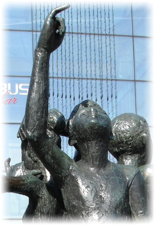 Sein Abbild ist in der Mitte des Brunnens als